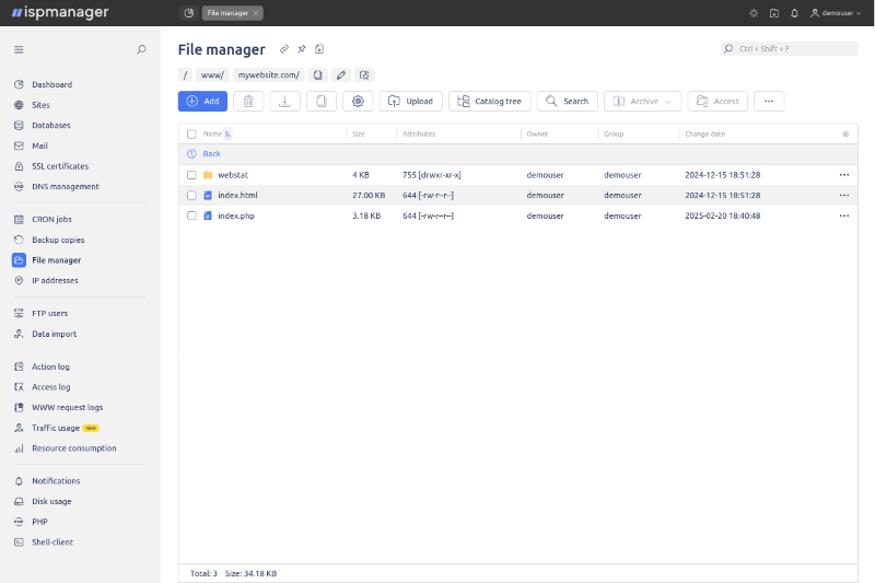 ISPManager — это русскоязычная панель управления с интуитивным интерфейсом для размещения сайтов, управления почтой, базами данных и резервными копиями.