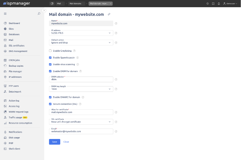 Полное почтовое решение с созданием аккаунтов, фильтрами и защитой от спама.