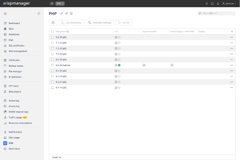Хороший вариант для интернет магазинов, агентских сайтов, SaaS и активных CMS. ISPManager PRO позволяет управлять десятками сайтов, использовать Docker и лимиты CloudLinux для изоляции и стабильной работы.
